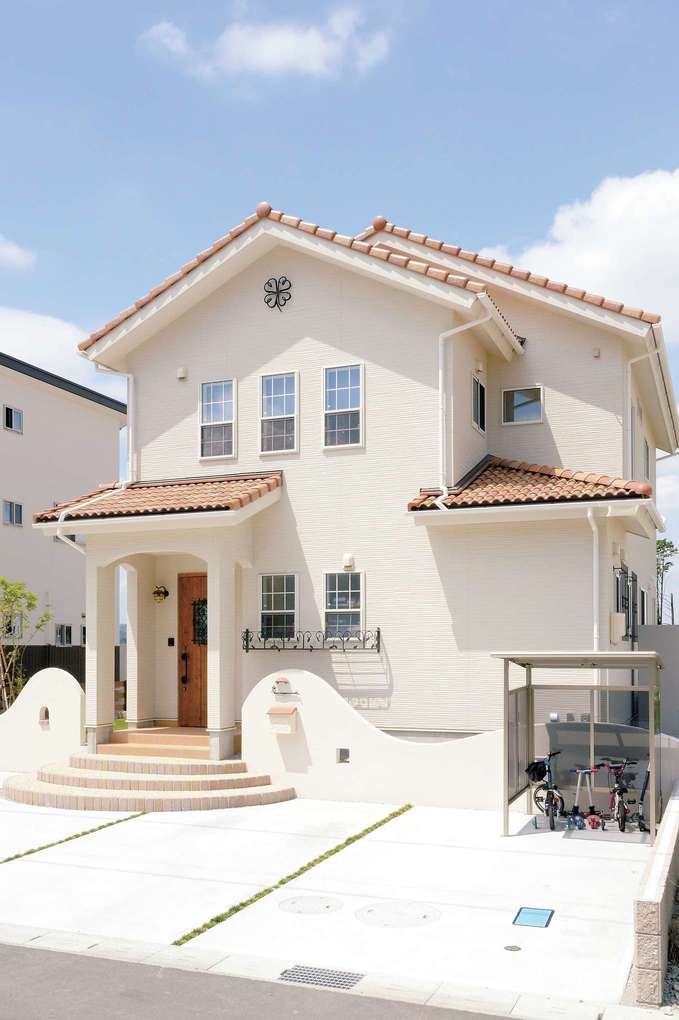 オレンジの瓦にクリーム色の壁かわいい玄関ポーチ理想通りの