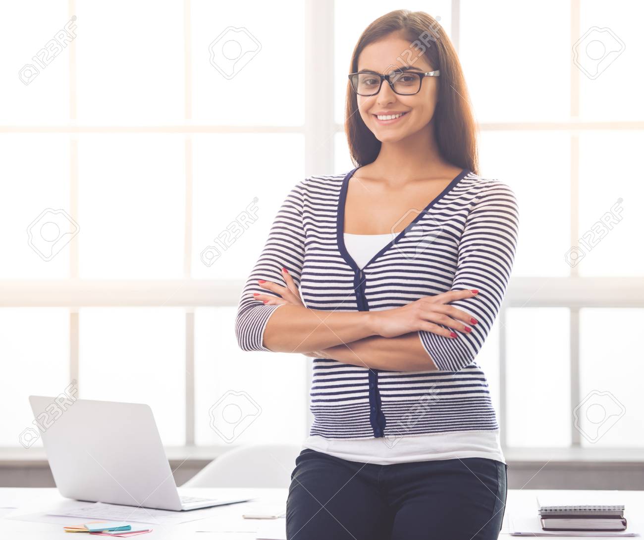 美しいビジネス スマート カジュアルな服装と眼鏡の女性はカメラ目線とオフィスで組んだ腕で立ちながら笑顔