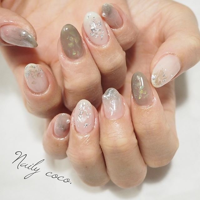 Pookaluna さんのネイルデザイン 上品グレージュパールが素敵