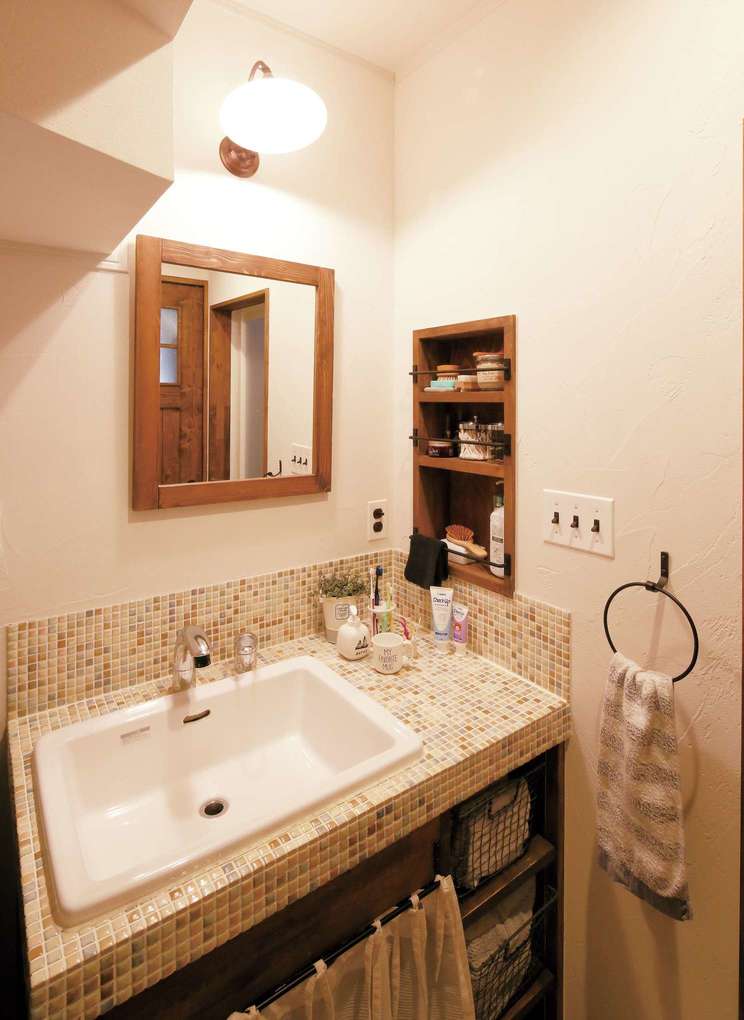 タイルとモルタルでレトロ調に仕上げた洗面所 洗面所家洗面