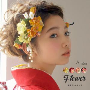 髪飾り 3点セット 花 サーモンピンク 和柄 縮緬 簪 かんざし 花 成人式 振袖 卒業式 袴 結婚式 ドレス 婚礼 着物 髪かざり 振り袖 髪留め