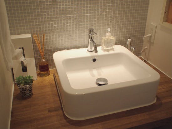 白タイルとグレーカウンター定番組み合わせの洗面台 第一