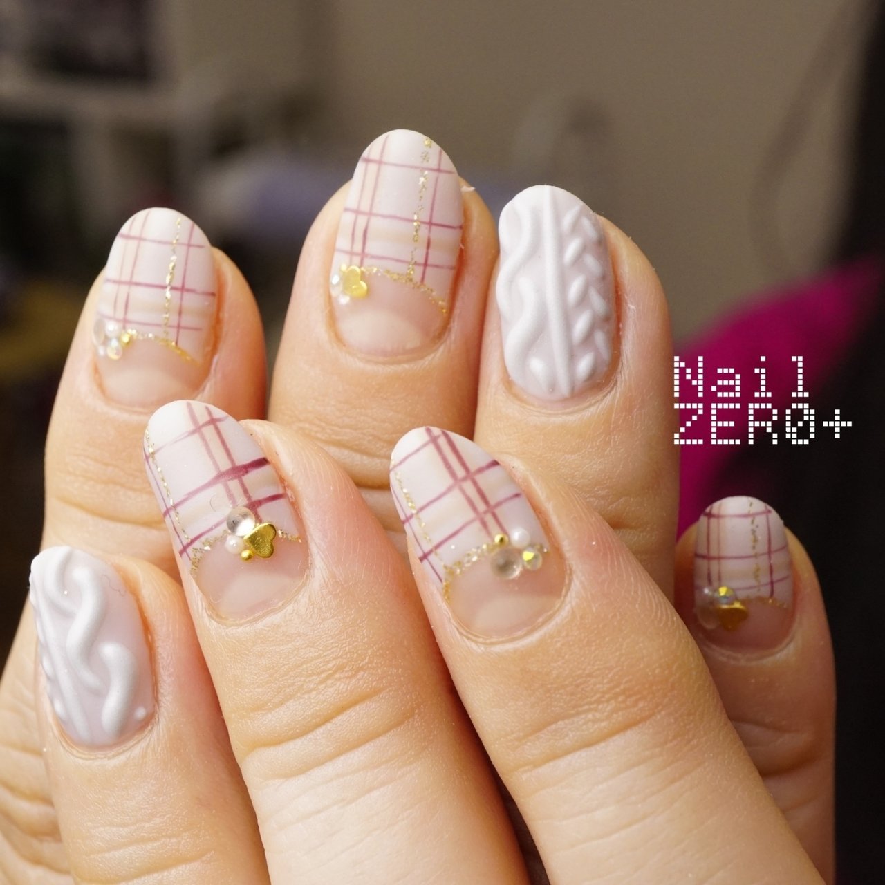大人可愛いピンクとホワイトのニットネイル Bronze Eye