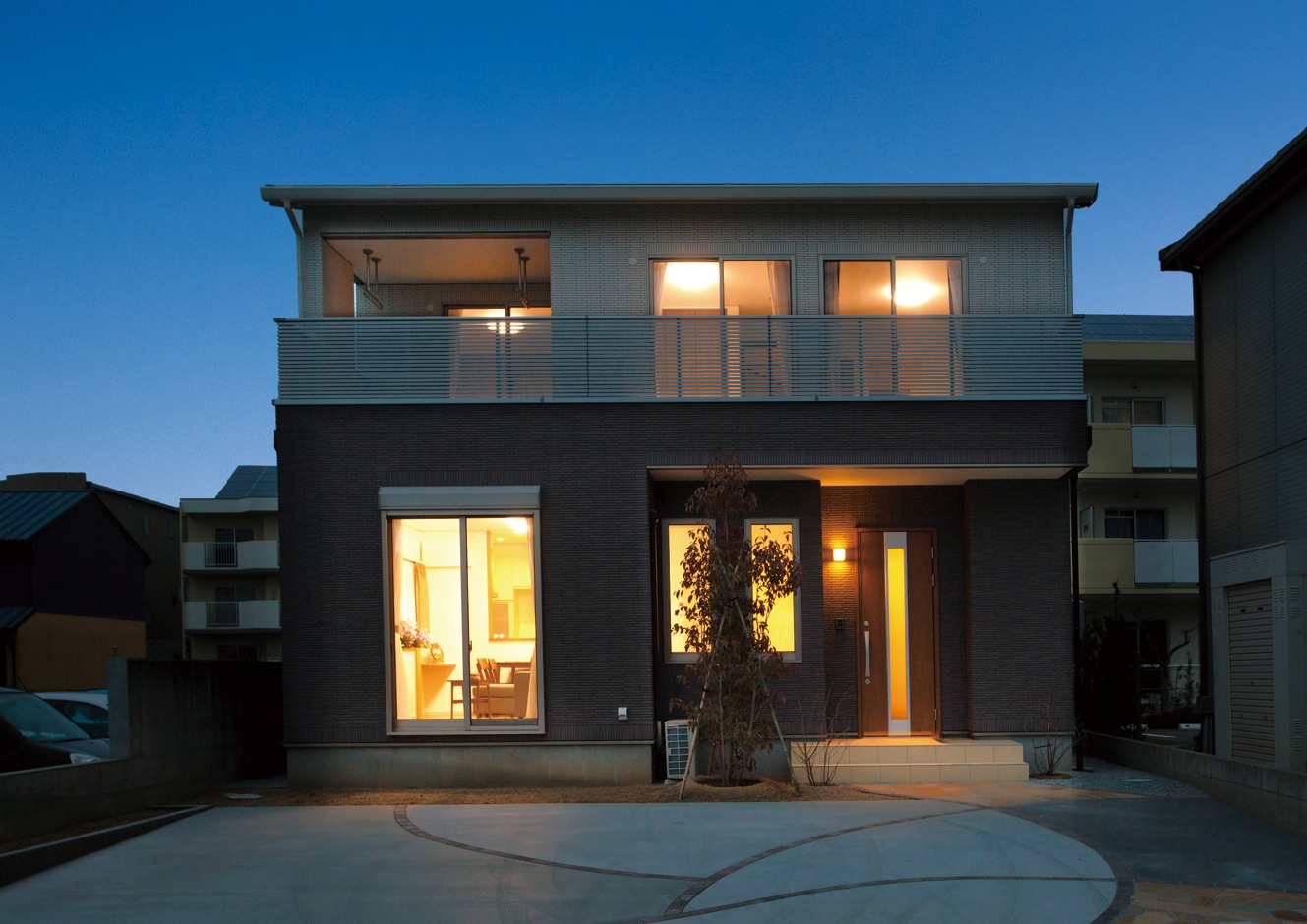 全面タイル調外壁の重厚感あるお家が完成おしゃれな照明と