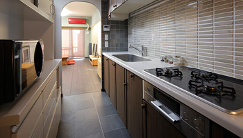 中央区 月島 おしゃれなタイル貼りのキッチンにスケルトンリフォーム
